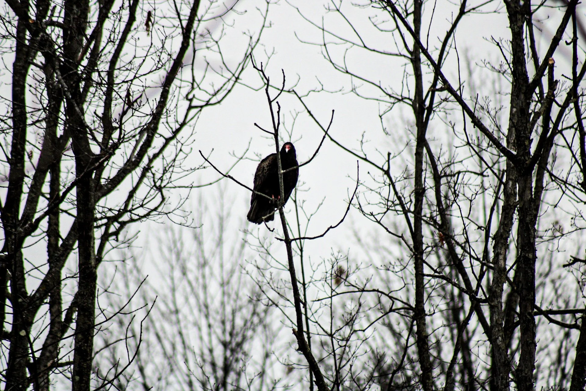 I spotted this one during a recent trip to Ticonderoga. It was perched high in the bare branches of a winter tree, completely still, surveying everything below it with that unmistakable red head and dark silhouette. Then it dropped off the branch and opened those wings — and I had maybe two seconds to get the shot.